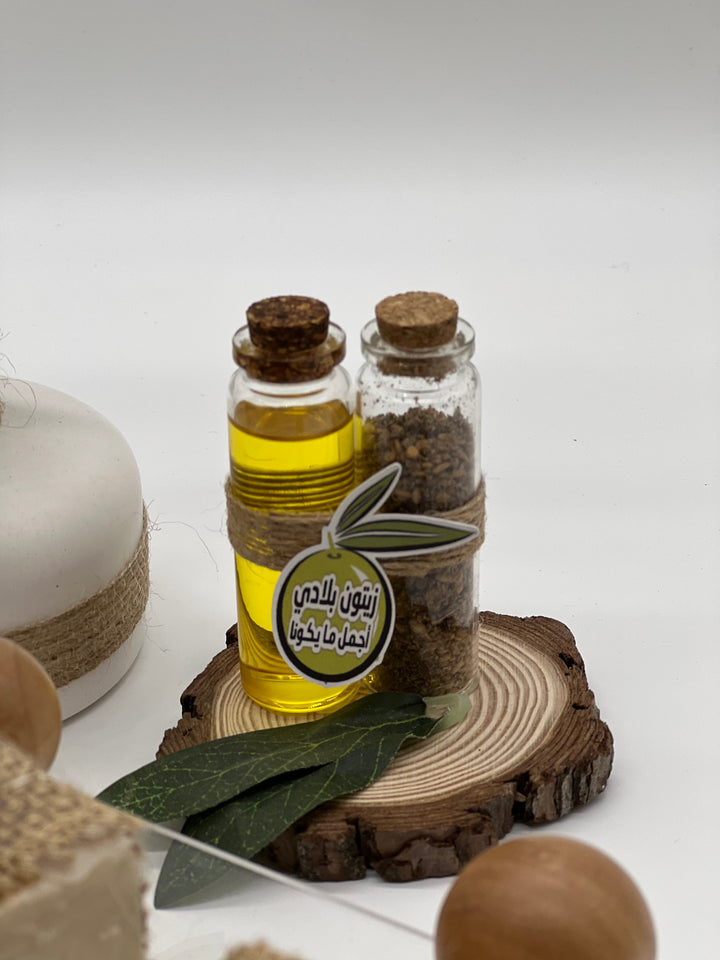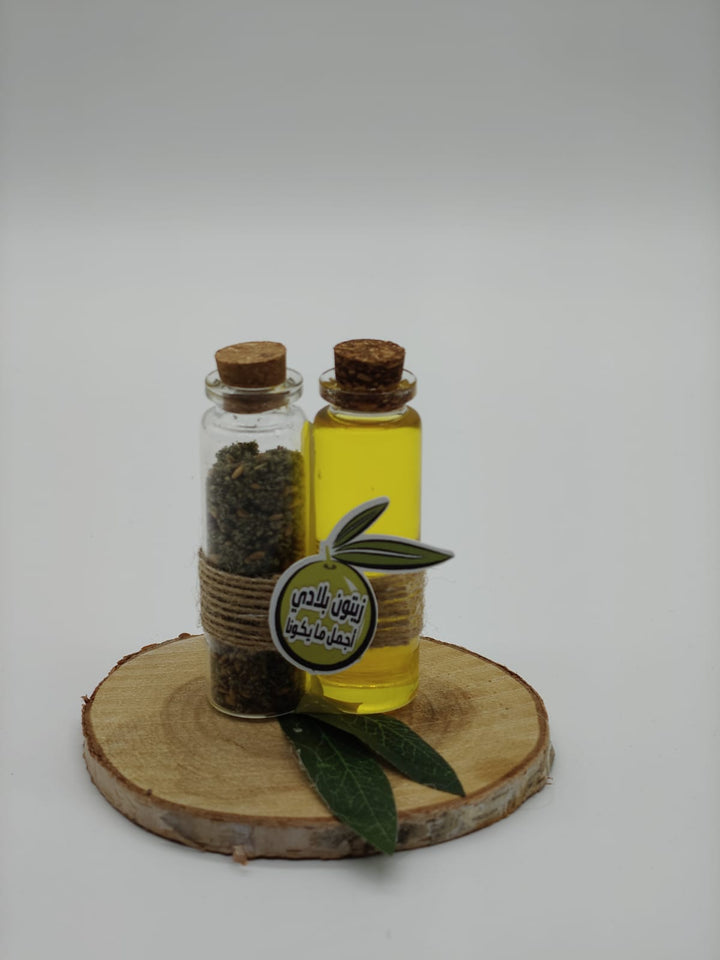 تجمع بين الأصالة والبساطة في عبوتين زجاجيتين صغيرتين، الأولى تحتوي على زيت زيتون بلدي فاخر بلونه الذهبي الدافئ، والثانية مملوءة بخليط الزعتر الجبلي العطِر.