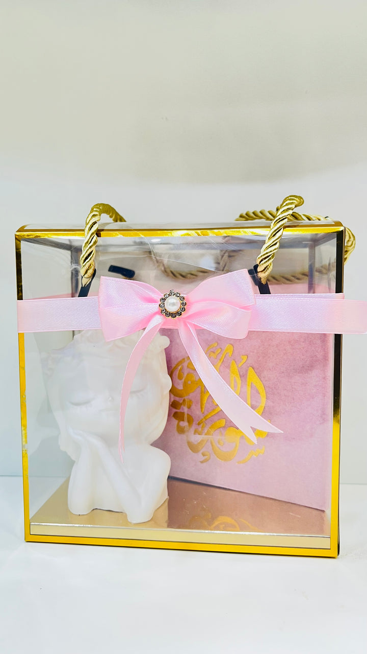 يحتوي بداخله على تمثال ديكوري أبيض أنيق، إلى جانب بطاقة أو كتيّب صغير مزيّن بالمخمل الوردي الفخم والمكتوب عليه سورة الكهف أو سورة البقرة بخط ذهبي فاخر — ليجمع بين الأناقة والبركة في آنٍ واحد.