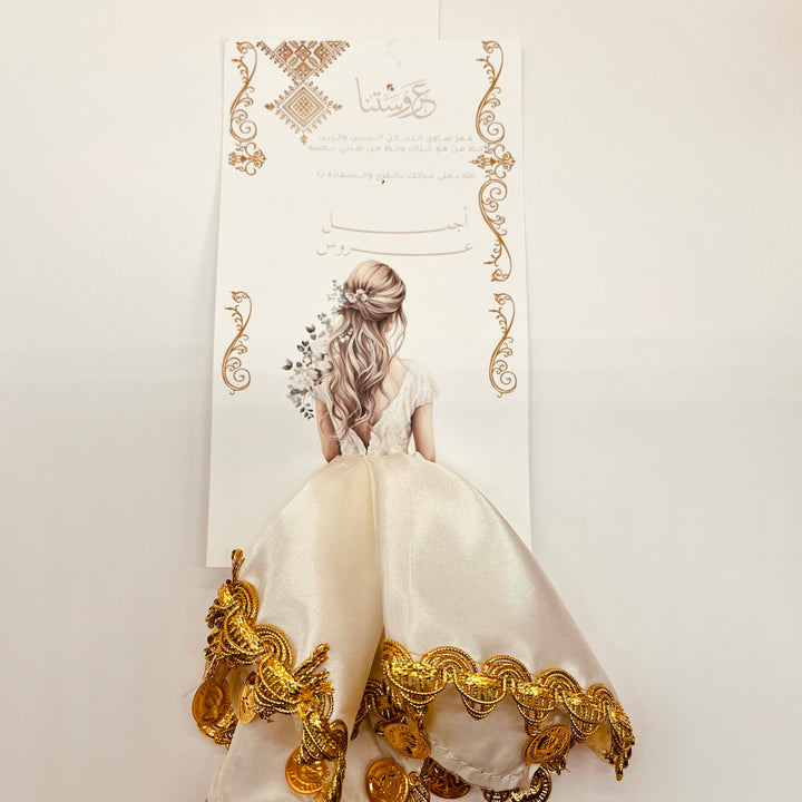 توزيعة أنيقة ومبتكرة مستوحاة من فستان العروس. تتكون من كرت مطبوع بتصاميم خاصة وقماشة ستان على شكل فستان العروس مزينة بليرات ذهبية