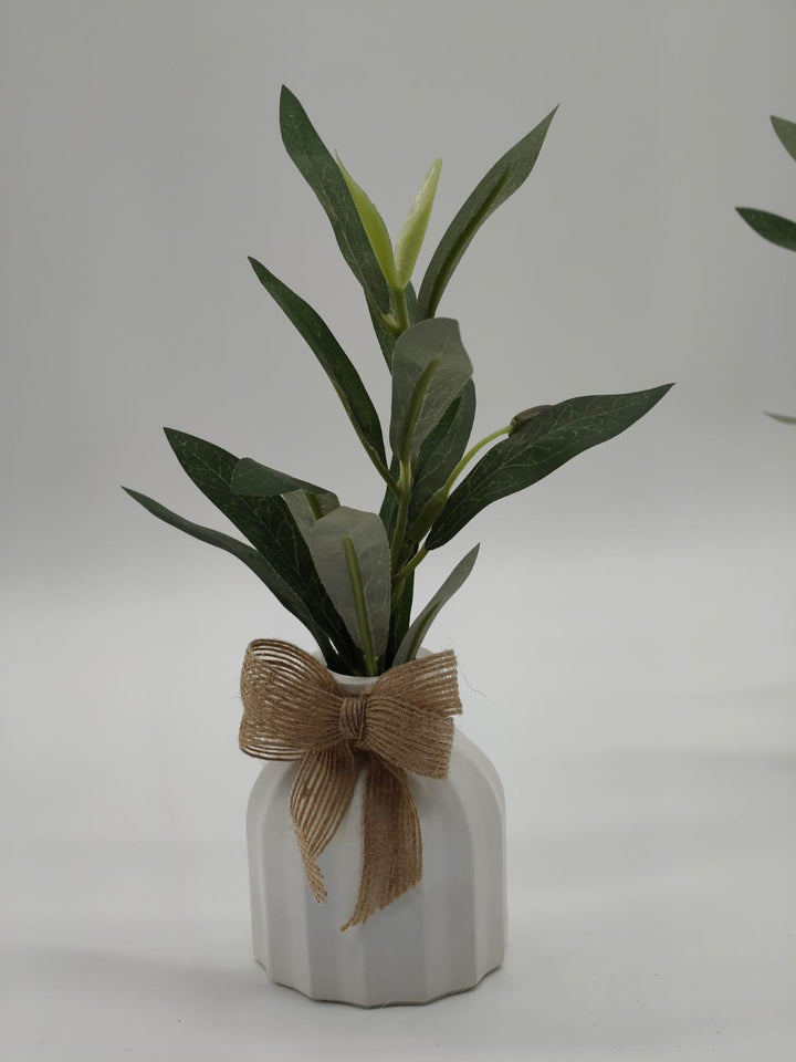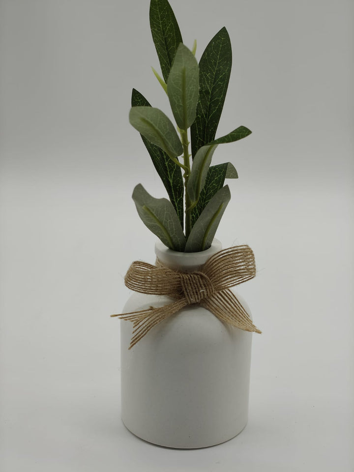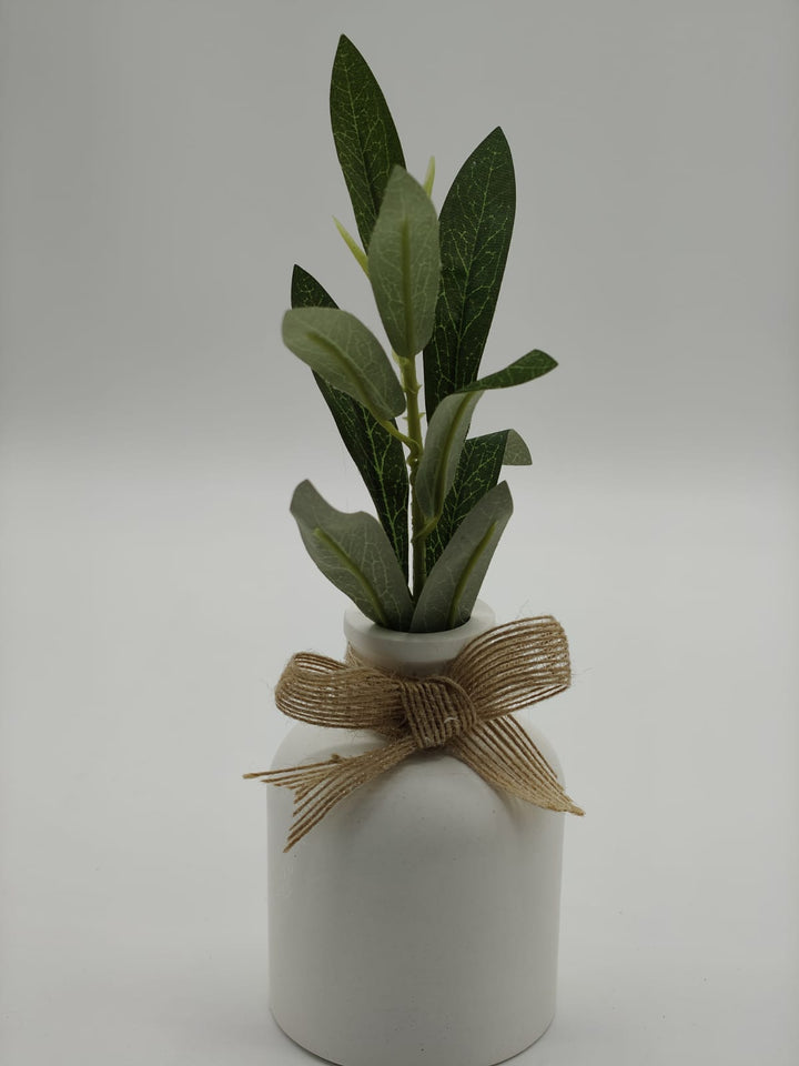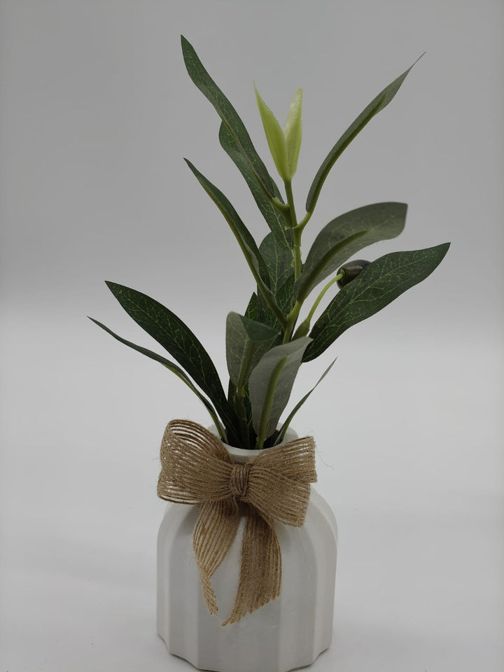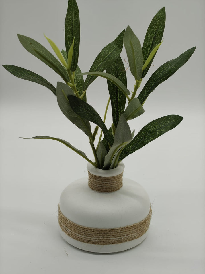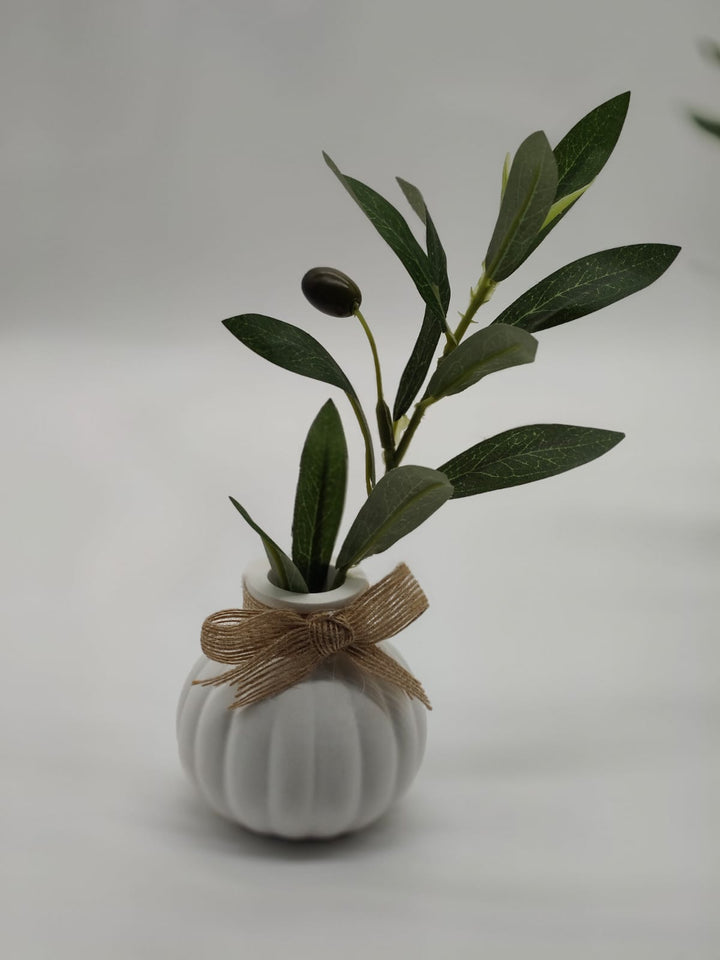 مزهرية سيراميكية صغيرة بتصميم ناعم وألوان طبيعية، مزينة بفرع زيتون صناعي عالي الجودة يرمز إلى السلام والبركة والجذور الفلسطينية الأصيلة.